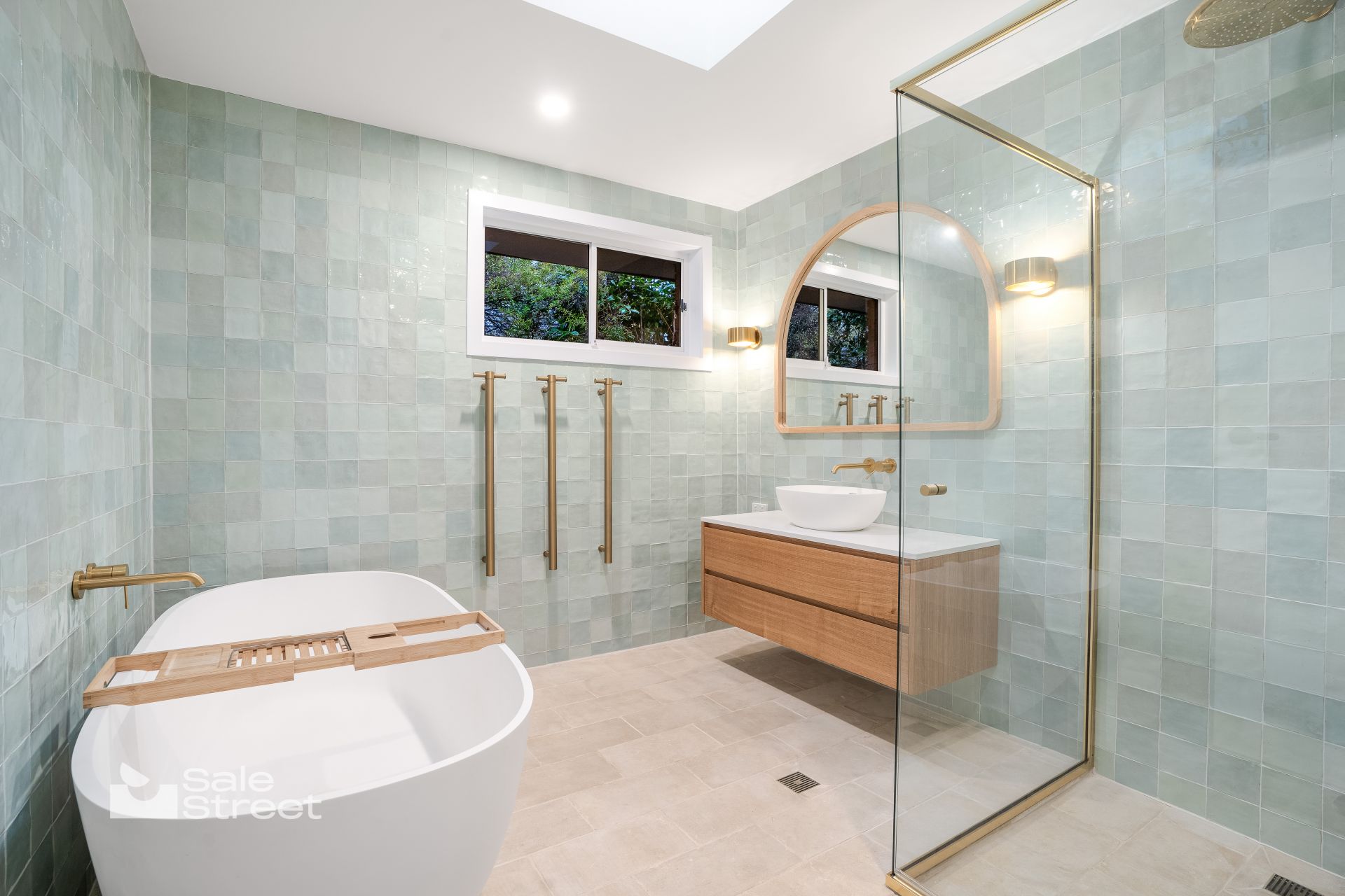Bathroom envy: freestanding tub, walk-in shower, brushed gold fixtures… you’ll actually want to do your skincare routine here.