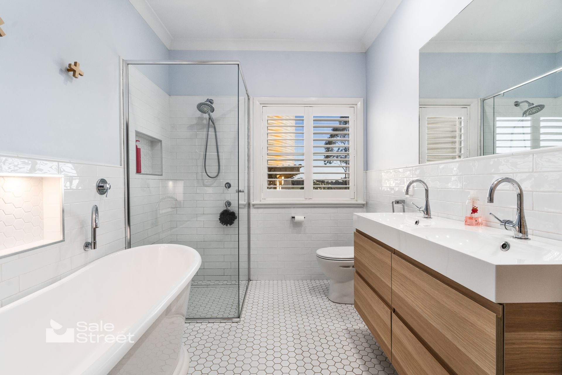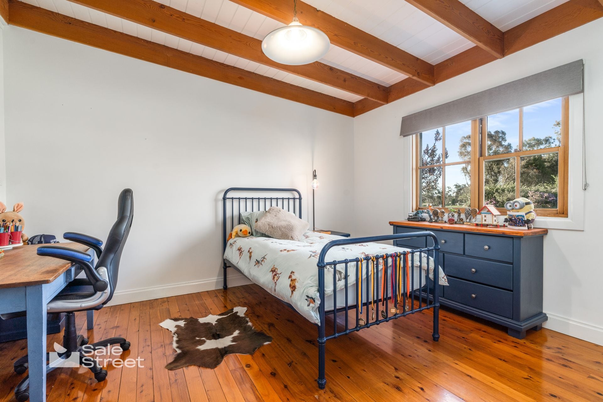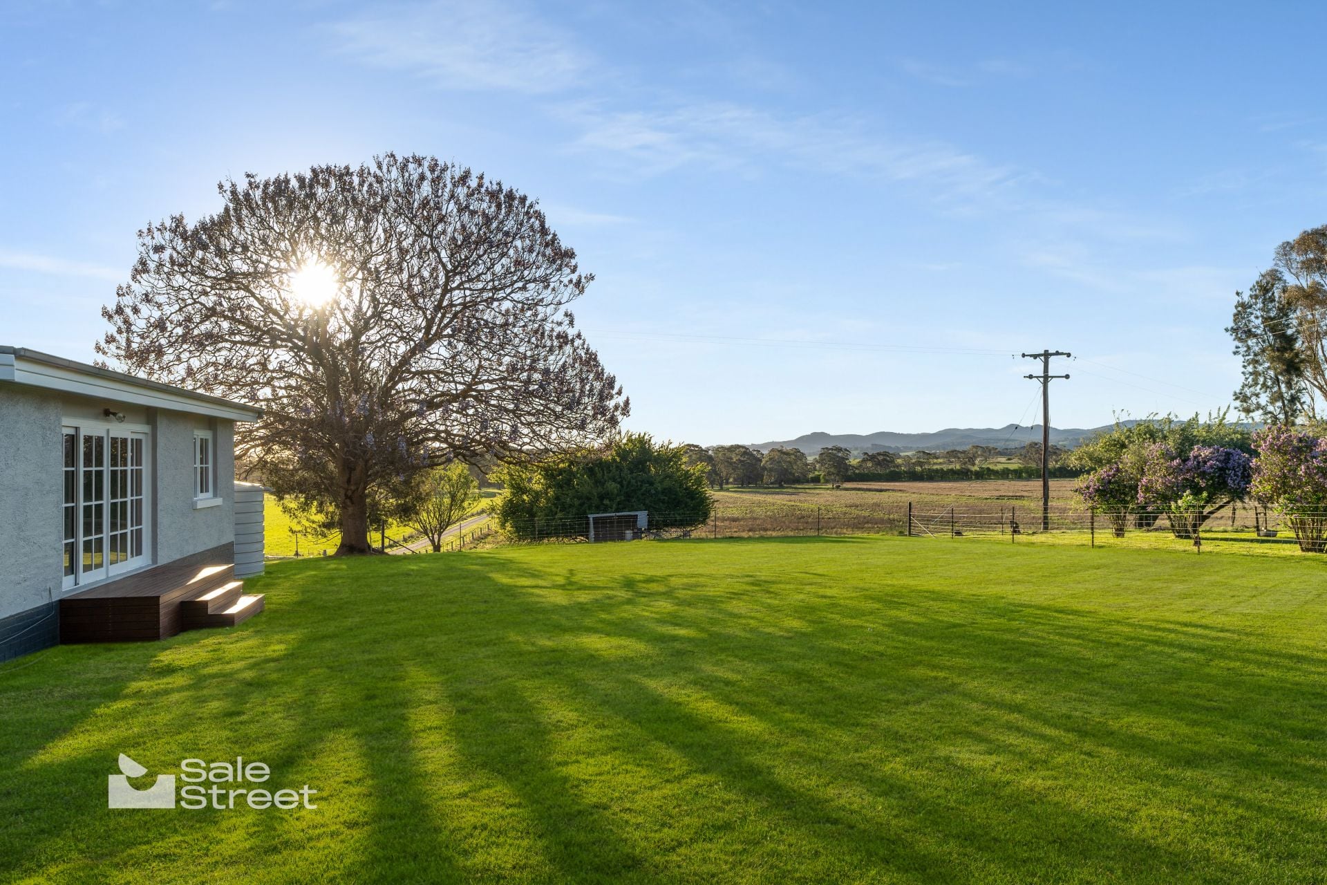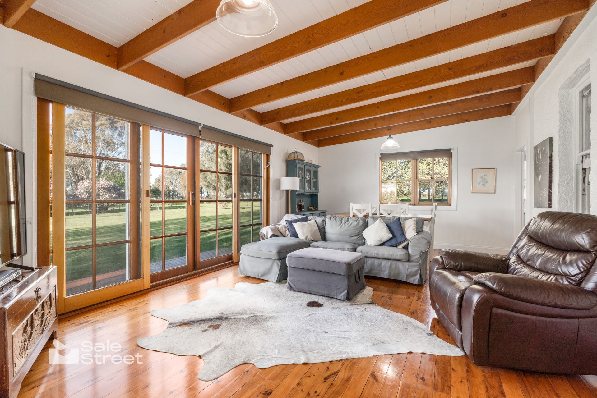 Inside, the home offers four generous bedrooms and two distinct living zones. A north-facing sunroom captures all-day warmth and spectacular sunsets, overlooking sweeping lawns and mature trees. The country-style kitchen balances charm and practicality with Victorian Ash benchtops, a quality Smeg cooker and leafy garden outlook. The main bathroom includes under-floor heating, complemented by a second toilet in the renovated laundry.